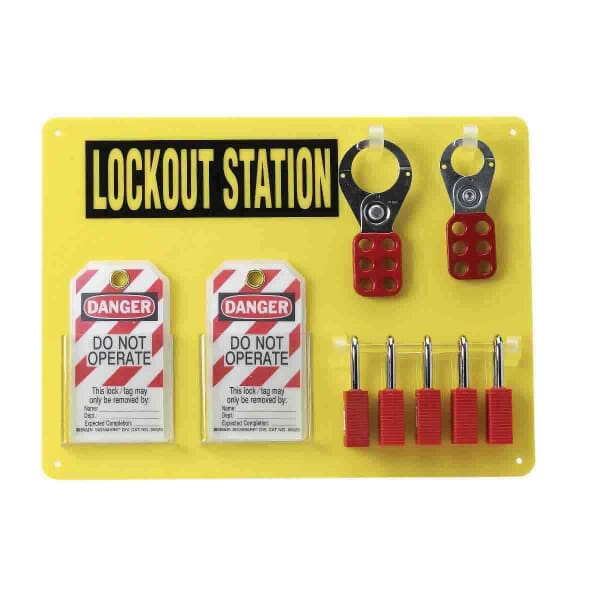 Brady Padlock Center, Filled Filled/Unfilled, Language: English, 19 Piece, 5 Padlocks Maximum, 11-1/2 in Height, 15-1/2 in Width, 3/16 in Depth, Wall Mounting, Legend: LOCKOUT STATION, Acrylic, Black on Yellow