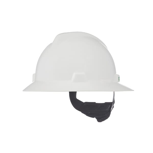MSA V-Gard Hard Hat, Full Brim, Standard Size, Fits Minimum Hat Size: SZ 6-1/2 to 8, White, Polyethylene, 4-Point Fas-Trac III Suspension, ANSI Electrical Class Rating: Class E, ANSI Impact Rating: Type I, Slotted: Yes, Ratchet Adjustment