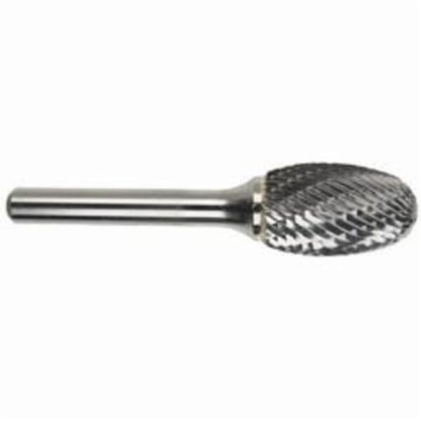 MORSE Carbide Burr, Premium, Series: 5970, 5/8 in Head Dia, 1 in Length of Cut, 2-3/4 in Overall Length, Oval Head Shape, Double Cut Type, 1/4 in Shank Dia, Solid Carbide Head, Bright Head Coating, 45 deg Included Angle, 23000 rpm Maximum, Applicable Materials: Brass, Cast Iron and Copper, SE-6 Industry Specification