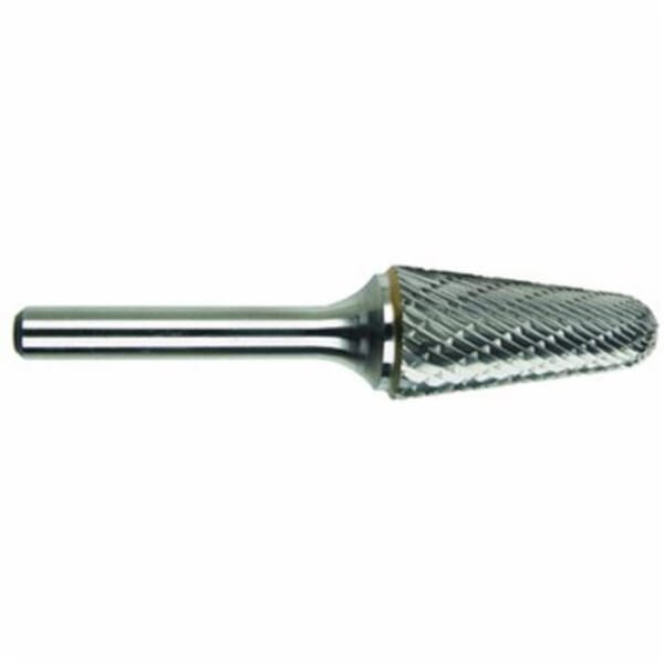 MORSE Carbide Burr, Premium, Series: 5970, Radius, 5/8 in Head Dia, 1-3/16 in Length of Cut, Taper Head Shape, Double Cut Type, 1/4 in Shank Dia, Solid Carbide Head, Bright Head Coating, 14 deg Included Angle, 23000 rpm Maximum, Applicable Materials: Brass, Cast Iron and Copper, SL-5 Industry Specification