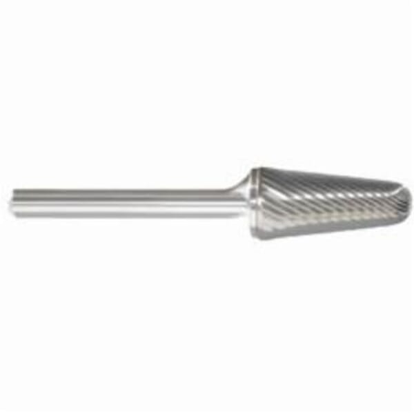 MORSE Carbide Burr, General Purpose Premium, Series: 5970, Radius, 1/2 in Head Dia, 1-1/8 in Length of Cut, 2-7/8 in Overall Length, Taper Head Shape, Single Cut Type, 1/4 in Shank Dia, Solid Carbide Head, Bright Head Coating, 14 deg Included Angle, 36000 rpm Maximum, Applicable Materials: Cast Iron, Ferrous Metals and Steel, SL-4 Industry Specification