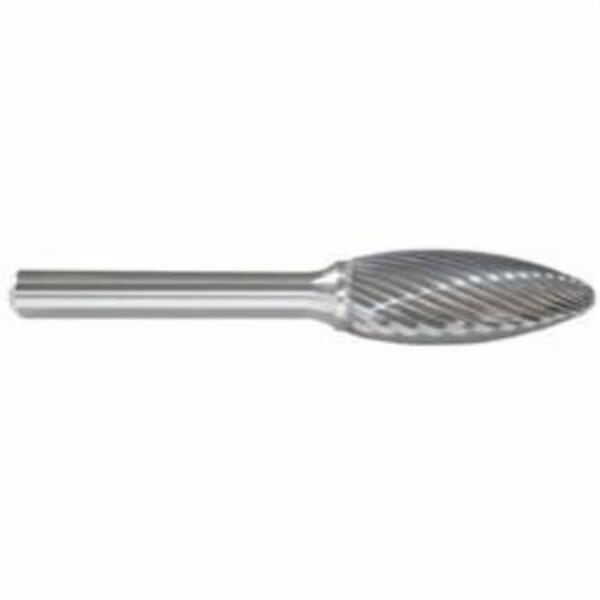MORSE Carbide Burr, General Purpose Premium, Series: 5970, 1/4 in Head Dia, 5/8 in Length of Cut, 2 in Overall Length, Flame Head Shape, Single Cut Type, 1/4 in Shank Dia, Solid Carbide Head, Bright Head Coating, 45 deg Included Angle, 50000 rpm Maximum, Applicable Materials: Cast Iron, Ferrous Metals and Steel, SH-1 Industry Specification