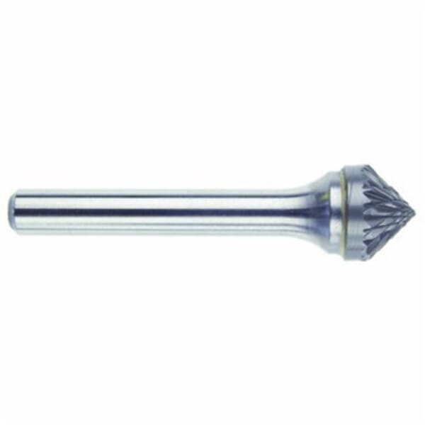 MORSE Edge Hog Carbide Burr, Premium, Series: 5970, 1/4 in Diameter Head, 1/8 in Length of Cut, Cone Head Shape, Double Cut, 1/4 in Shank Diameter, Solid Carbide Head, Bright Head Coating, 90 deg Included Angle, 50000 rpm Maximum, Applicable Materials: Brass, Cast Iron and Copper, Industry Specification: SK-1