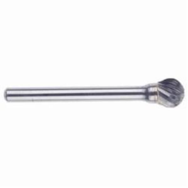 MORSE Carbide Burr, General Purpose Premium, Series: 5970, 1 in Head Dia, 15/16 in Length of Cut, 2-3/4 in Overall Length, Ball Head Shape, Single Cut Type, 1/4 in Shank Dia, Solid Carbide Head, Bright Head Coating, 18000 rpm Maximum, Applicable Materials: Cast Iron, Ferrous Metals and Steel, SD-9 Industry Specification
