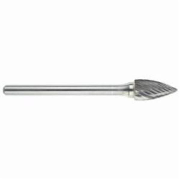 MORSE Carbide Burr, General Purpose Premium, Series: 5970, Pointed, 3/4 in Head Dia, 1-1/2 in Length of Cut, 2-3/4 in Overall Length, Tree Head Shape, Single Cut Type, 1/4 in Shank Dia, Solid Carbide Head, Bright Head Coating, 45 deg Included Angle, 19000 rpm Maximum, Applicable Materials: Cast Iron, Ferrous Metals and Steel, SG-15 Industry Specification