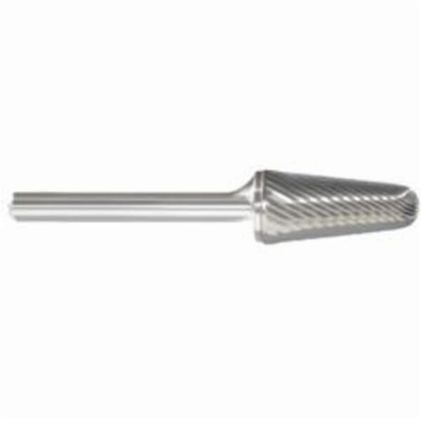 MORSE Carbide Burr, General Purpose Premium, Series: 5970, Radius, 5/8 in Head Dia, 1-3/16 in Length of Cut, 2-15/16 in Overall Length, Taper Head Shape, Single Cut Type, 1/4 in Shank Dia, Solid Carbide Head, Bright Head Coating, 14 deg Included Angle, 23000 rpm Maximum, Applicable Materials: Cast Iron, Ferrous Metals and Steel, SL-5 Industry Specification