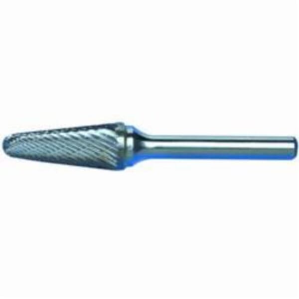 MARXMAN Carbide Burr, General Purpose, Series: 597, Radius, 3/4 in Head Dia, 1-1/2 in Length of Cut, Taper Head Shape, Single Cut Type, 1/4 in Shank Dia, Solid Carbide Head, Bright Head Coating, 14 deg Included Angle, 19000 rpm Maximum, Applicable Materials: Cast Iron, Ferrous Metals and Steel, SL-7 Industry Specification