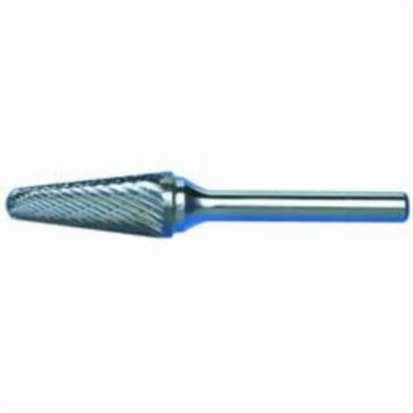 MARXMAN Carbide Burr, General Purpose, Series: 597, Radius, 5/8 in Head Dia, 1-3/16 in Length of Cut, Taper Head Shape, Double Cut Type, 1/4 in Shank Dia, Solid Carbide Head, Bright Head Coating, 14 deg Included Angle, 23000 rpm Maximum, Applicable Materials: Brass, Cast Iron and Copper, SL-5 Industry Specification