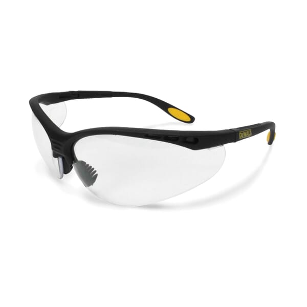 The DeWALT Reinforcer Safety Glass provides an ergonomically position handgrip pattern on the temple for a secure grip.