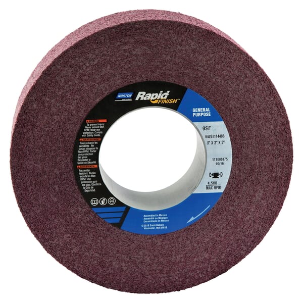 Norton Bear-Tex Rapid Finish Non-Woven Abrasive Wheel, Convolute, Silicon Carbide Abrasive, 8 in Wheel Diameter, 3 in Center Hole, 2 in Face Width, Fine Grade, 4500 rpm Maximum, 9 Density Number, Maroon