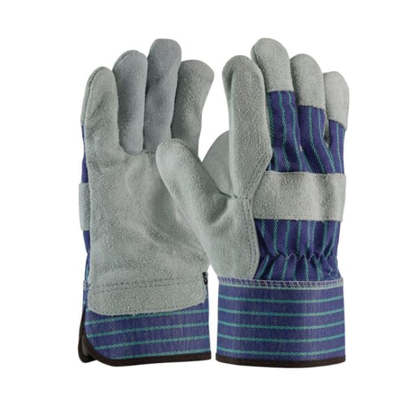 PIP, 82-7563/S, General Purpose Gloves, A/B-Grade, Series: Silver 82-7563, Work Glove, Shoulder Split Cowhide Leather Palm, 75% Cowhide Leather/25% Cotton, Blue/Green/White, Gunn Cut/Wing Thumb Style, Cotton Lining, Safety Cuff, Uncoated Coating, Elastic Closure, 9.6 in Length, Resists: Water