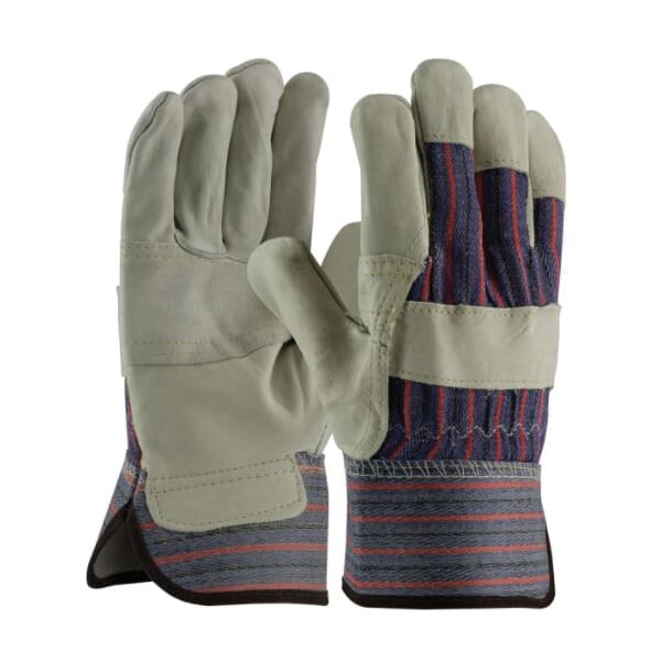 PIP, 87-1563P, General Purpose Gloves, Economy Grade, Top Grain Cowhide Leather Palm, 75% Cowhide Leather/25% Cotton, Black/Blue/Natural/Red, Gunn Cut/Wing Thumb Style, Cotton Lining, Safety Cuff, Uncoated Coating, Elastic/Knuckle Strap Closure, 10.2 in Length