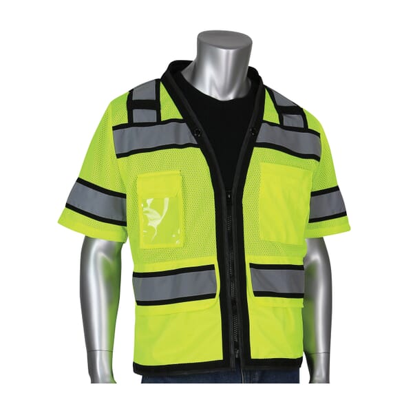 PIP Surveyors Vest, Series: 303-0800D, M, Hi-Viz Lime Yellow, Polyester Mesh, Black/Silver Stripe, 47 in Chest, 28 in Length, Zipper Closure, 11 Pockets, ANSI Class: Class 3, ANSI 107 Class 3 Type R Specifications Met