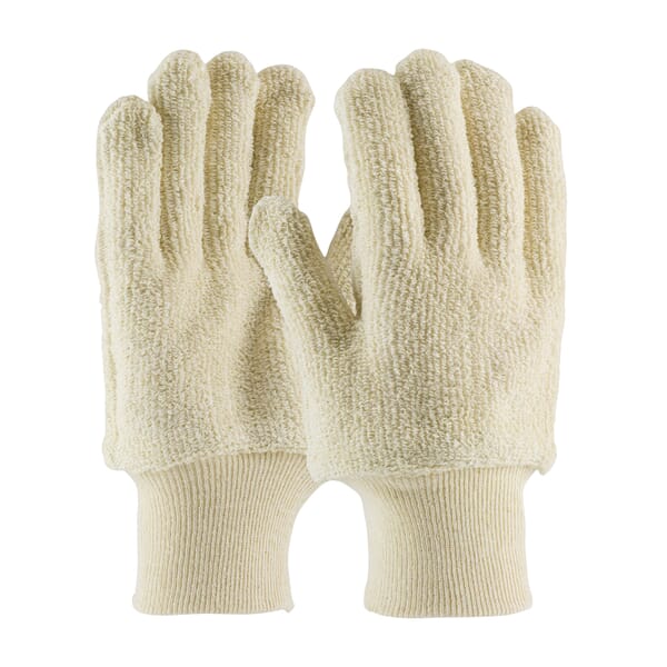PIP, 42-C700/L, Gloves, Loop-Out, Series: 42-C700, L Size, Cotton Terry Cloth Palm, Natural, Seamless Style, Unlined Lining, Knit Wrist Cuff, Bright Coating, 10-1/2 in Length, Resists: Abrasion, Cut and Heat