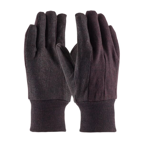 PIP, 95-809PD, General Purpose Gloves, Regular Weight, Work Glove, Universal Size, PVC Palm, Cotton/Jersey/Polyester, Brown, Clute Cut/Straight Thumb Style, Cotton/Polyester Lining, Knit Wrist Cuff, Dotted Palm and Fingers Coating Coverage, 10 in Length