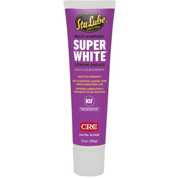 Sta-Lube Lithium Grease, Multi-Purpose Non-Flammable, Series: Super White, Tube, 10 oz, 10 oz Net Weight, Lithium-12 Base, Composition: Distillate (Petroleum), Hydro Treated 64742-52-5 Heavy Naphthenic, Zinc Oxide, Calcium 57855-77-3 Bis (Dinonylnaphthalenesulfonate), Semi-Solid to Solid Grease, White, Faint Petroleum, 0 to 300 deg F, 0.9 Specific Gravity, 475 deg F Flash, <0.9 g/L VOC, Flammability: 1 HMIS/NFPA, NLGI 2 Grade