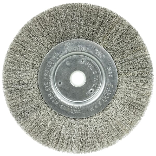 Weiler, 01675, Wheel Brush, Narrow Face, 6 in Diameter Brush, 3/4 in Face Width, 1/2 to 5/8 in Arbor Hole, Crimped Filament/Wire, 0.006 in Dia Filament/Wire, Stainless Steel Fill, 1-7/16 in Trim Length, 6000 rpm Maximum, Unthreaded Arbor Attachment