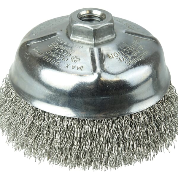 Weiler Cup Brush, 5 in Brush Dia, 5/8-11 UNC Arbor Hole Size, Crimped Filament/Wire, 0.02 in Filament/Wire Diameter, Stainless Steel Fill, 1-1/4 in Trim Length, 9000 rpm Maximum