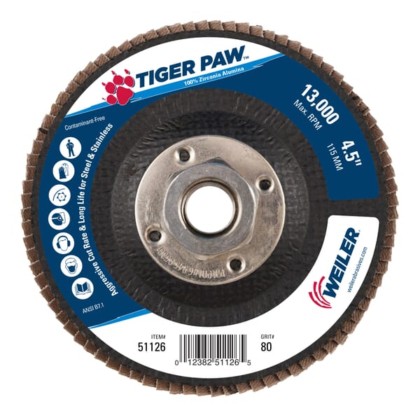 Weiler AbrasivesTiger Paw 51126 High Density High Performance Coated Abrasive Flap Disc, 4-1/2 in Dia Disc, 80 Grit, Medium Grade, Zirconia Alumina Abrasive, Type 29/Angled Disc