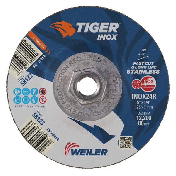 Tiger Inox, 58122, Depressed Center Grinding Wheel, Contaminant-Free Performance Line, 5 in Wheel Diameter, 1/4 in Wheel, Quick-Change Connector, 24 Grit, Coarse Grade, White Aluminum Oxide Abrasive, Wheel Type Number: Type 27, 12200 rpm Maximum, Resin Bond, Applicable Materials: Stainless Steel and Harder Steel Grades, 5/8-11 Center Hole Thread, Reinforced: Yes, Specifications Met: ANSI B7.1-2010