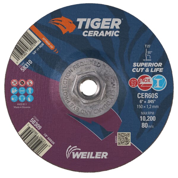 Tiger Ceramic, 58310, Depressed Center Cutting Wheel, Performance Line Superior Life and Cut, 6 in Wheel Diameter, 0.045 in Wheel, Quick-Change Connector, 60 Grit, Medium Grade, Ceramic Alumina Abrasive, Wheel Type Number: Type 27, 10200 rpm Maximum, Resin Bond, Applicable Materials: Tool Steel, Inconel, High Nickel Alloy, Titanium, Armored Steel, Stainless Steel and Hard-to-Cut Metals, 5/8-11 Center Hole Thread, Specifications Met: ANSI B7.1-2010