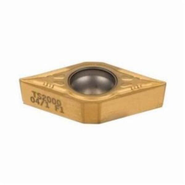 Seco Turning Insert, DCMT Insert, 11T304 Insert, Diamond, 3.75 mm Maximum Depth of Cut, 9.5 mm Inscribed Circle, 3.97 mm Thickness, 11 Seat, Positive Rake, F1 Chipbreaker, 0.4 mm Corner Radius, 4.5 mm Hole Dia, Manufacturers Grade: TS2000, ANSI Code: DCMT32.51-F1 TS2000, ISO Code: DCMT11T304-F1 TS2000, 55 deg Included Angle, 7 deg Relief Angle, Neutral Cutting, Carbide, TiAlN/TiN, Material Grade: M, S, For Use On: Stainless Steel and Titanium/Super Alloys