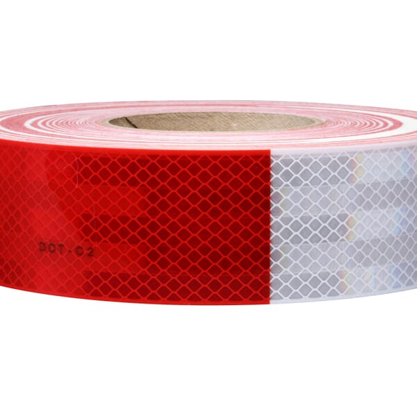 Roll of alternating 11 inch red and 7 inch white, highly reflective, microprismatic sheeting with pressure sensitive adhesive for easy application to trucks, trailers and large vehicles to enhance visibility and detection distance.