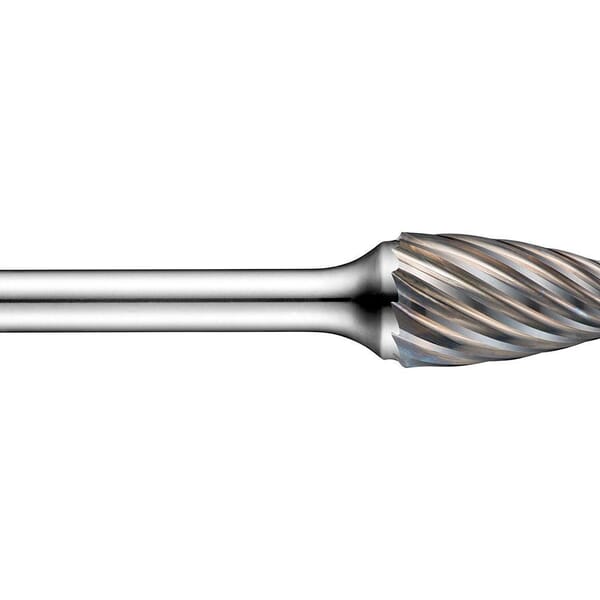 Dormer Carbide Burr, Standard, Series: P613, Pointed, 9.6 mm Head Dia, 19 mm Length of Cut, 64 mm Overall Length, Tree Head Shape, INOX Cut Type, 6 mm Shank Dia, Carbide Head, Bright Head Coating, Applicable Materials: Stainless Steel