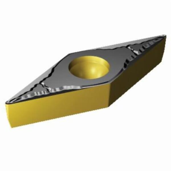 Sandvik Coromant Turning Insert, 1-Sided Basic Shape, Series: CoroTurn 107, VBMT Insert, 332 Insert, Diamond, 2.7 mm Maximum Depth of Cut, 3/8 in Inscribed Circle, 0.187 in Thickness, 0.6537 in Length, 16 Seat, Positive Rake, KM Chipbreaker, 0.031 in Corner Radius, 0.1732 in Hole Dia, Manufacturers Grade: 3210, ANSI Code: VBMT 332-KM 3210, ISO Code: VBMT 16 04 08-KM 3210, 35 deg Included Angle, 5 deg Relief Angle, Neutral Cutting, Carbide, TiCN/Al2O3/TiN, Material Grade: K, For Use On: Cast Iron