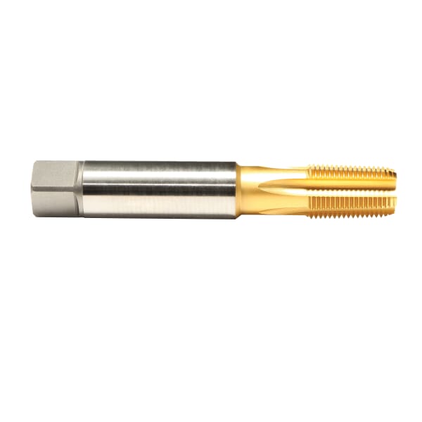 Emuge Pipe Tap, Form C Long Reinforced Shank, Series: Rekord 2-KEG STEEL CW181400, Measurement System: Imperial, 1/16-27 Thread, NPTF Thread Standard, 0 deg Helix Angle, Modified Bottoming Chamfer, 0.69 in Thread Length, 3-1/2 in Overall Length, 4 Flutes, Right Hand Cutting Direction, 5/16 in Shank Diameter, 0.234 in Square, HSS-E, TiN Coated