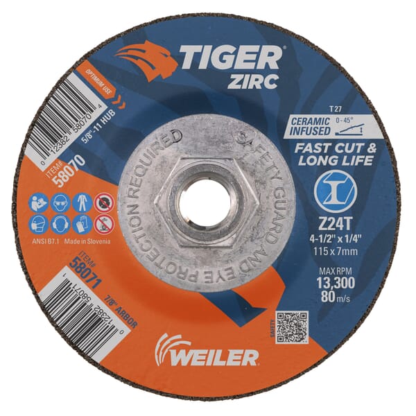 Tiger Zirc, 58070, Depressed Center Grinding Wheel, Performance Line, 4-1/2 in Wheel Diameter, 1/4 in Wheel, Quick-Change Connector, 24 Grit, Coarse Grade, Zirconia Alumina Abrasive, Wheel Type Number: Type 27, 13300 rpm Maximum, Resin Bond, Applicable Materials: Carbon Steel, Structural Steel, Cast Iron, Steel and Stainless Steel, 5/8-11 Center Hole Thread, Wheel Hardness: T, Reinforced: Yes, Specifications Met: ANSI B7.1-2010