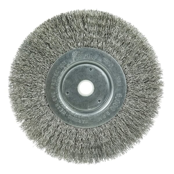 Weiler, 01695, Wheel Brush, Narrow Face, Series: TLN-6, 6 in Diameter Brush, 3/4 in Face Width, 1/2 to 5/8 in Arbor Hole, Crimped Filament/Wire, 0.0104 in Dia Filament/Wire, Stainless Steel Fill, 1-7/16 in Trim Length, 6000 rpm Maximum, Unthreaded Arbor Attachment