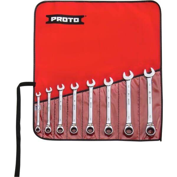 Proto Wrench Set, Anti-Slip Ratcheting Reversible, Metric System of Measurement, 8 to 18 mm, 8 Piece, 12 Point, 72 Geared Teeth, Open End Drive, Full Polished